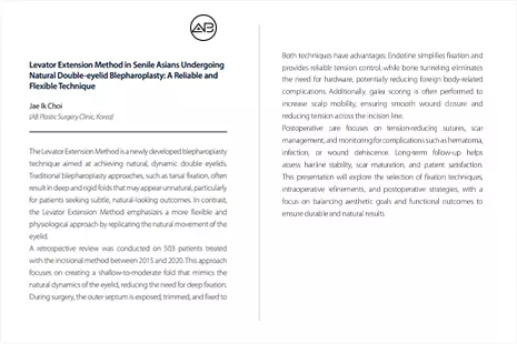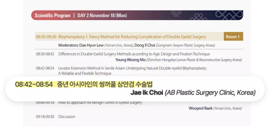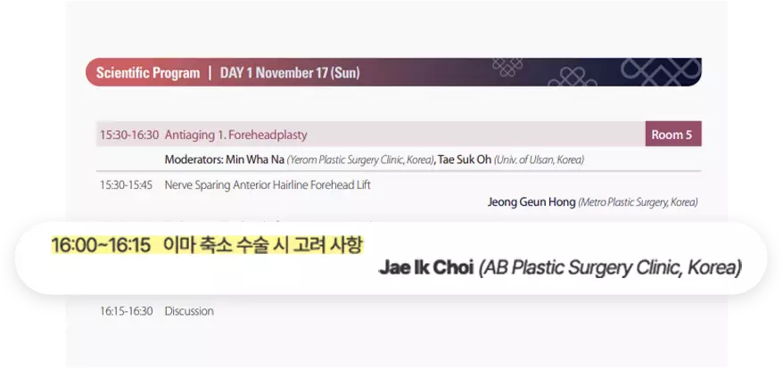 ในการประชุมครั้งนี้ ทีมแพทย์จาก โรงพยาบาลศัลยกรรม AB ได้รับเชิญให้บรรยายเกี่ยวกับ ศัลยกรรมลดขนาดหน้าผาก และ การทำตาสองชั้นช่วงบนสำหรับคนไข้วัยกลางคนชาวเอเชีย