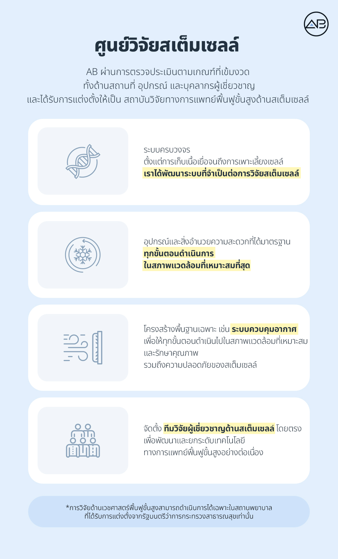 เพื่อการวิจัยที่ได้มาตรฐานสูงสุดโรงพยาบาลศัลยกรรม AB ได้ลงทุนสร้างโครงสร้างพื้นฐานด้านเทคโนโลยีขั้นสูง เช่น ระบบควบคุมสภาพอากาศภายใน ห้องและอุปกรณ์สำหรับรักษาคุณภาพและความปลอดภัยของเซลล์