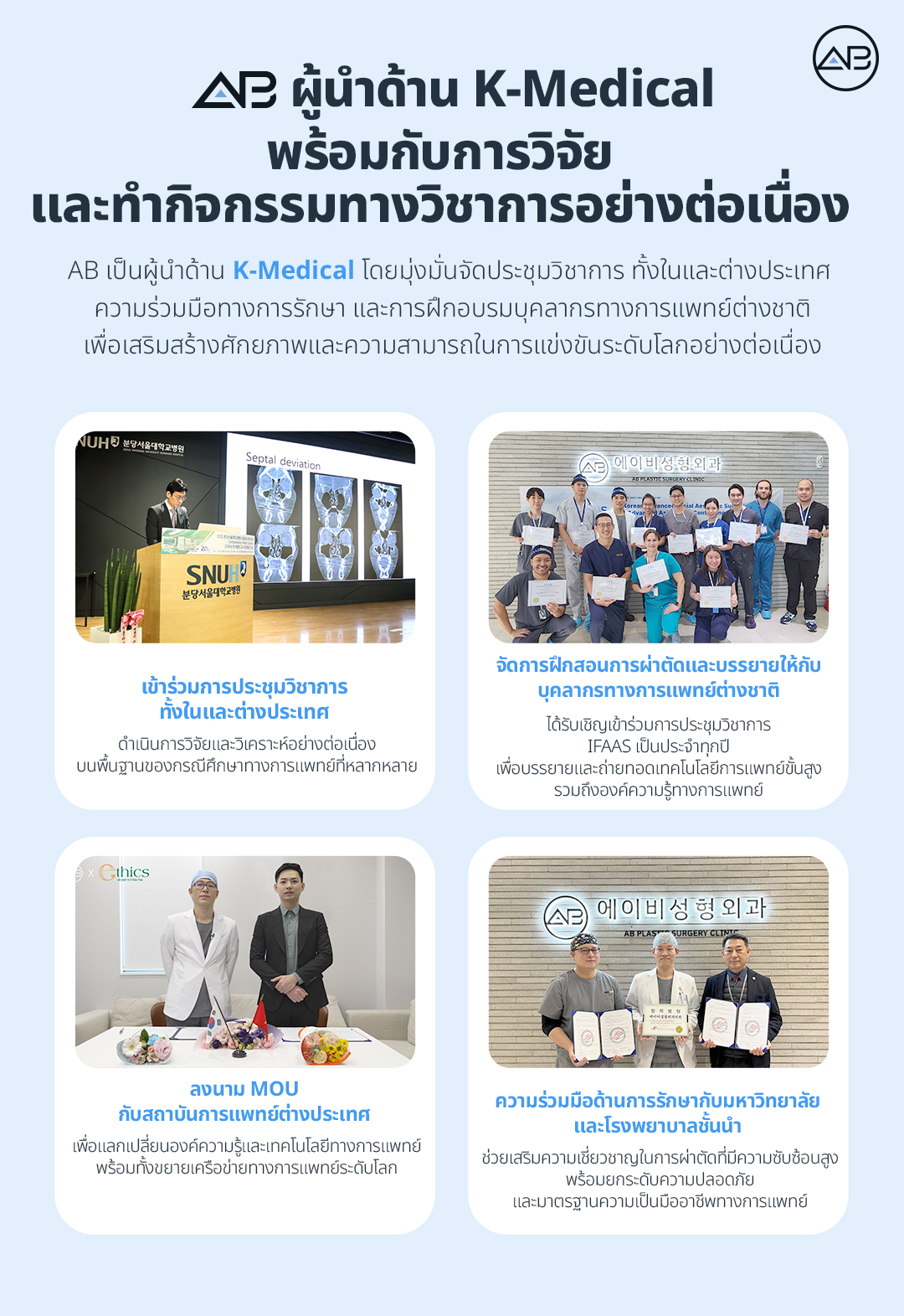 โรงพยาบาลศัลยกรรม AB กำลังขยายเครือข่ายระดับโลกอย่างต่อเนื่อง ผ่านการจัดสัมมนาวิชาการทั้งในและต่างประเทศ รวมถึงการบรรยายผ่าตัดให้แก่บุคลากรทางการแพทย์ต่างชาติ การได้รับการรับรองอย่างเป็นทางการจากรัฐบาลให้เป็น “สถาบันเวชศาสตร์ฟื้นฟูขั้นสูง” ในครั้งนี้ ยิ่งทำให้สถานะของโรงพยาบาลศัลยกรรม AB แข็งแกร่งยิ่งขึ้น และเป็นก้าวสำคัญในการขยายความเชี่ยวชาญและอิทธิพลในด้านการวิจัยชะลอวัยและการฟื้นฟูผิวด้วยสเต็มเซลล์ขั้นสูง