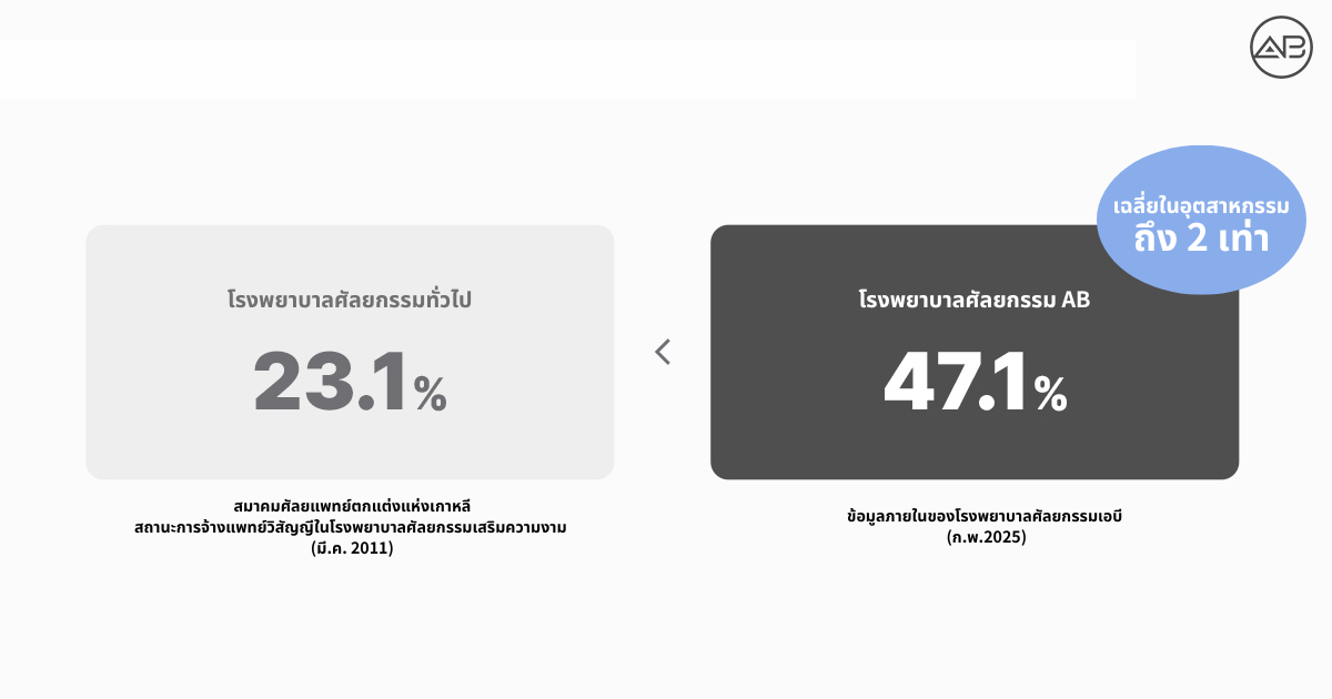 การให้ยาสลบถือเป็นหนึ่งในปัจจัยด้านความปลอดภัยที่สำคัญที่สุดในการศัลยกรรมความงาม โดยโรงพยาบาล AB มี วิสัญญีแพทย์ประจำในอัตรา 47.1% ซึ่งเป็นระบบความปลอดภัยด้านการดมยาสลบที่มีระดับสูงกว่าค่าเฉลี่ยของสถานพยาบาลระดับโรงพยาบาลประมาณ 2 เท่า