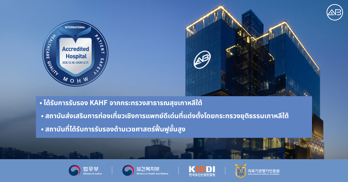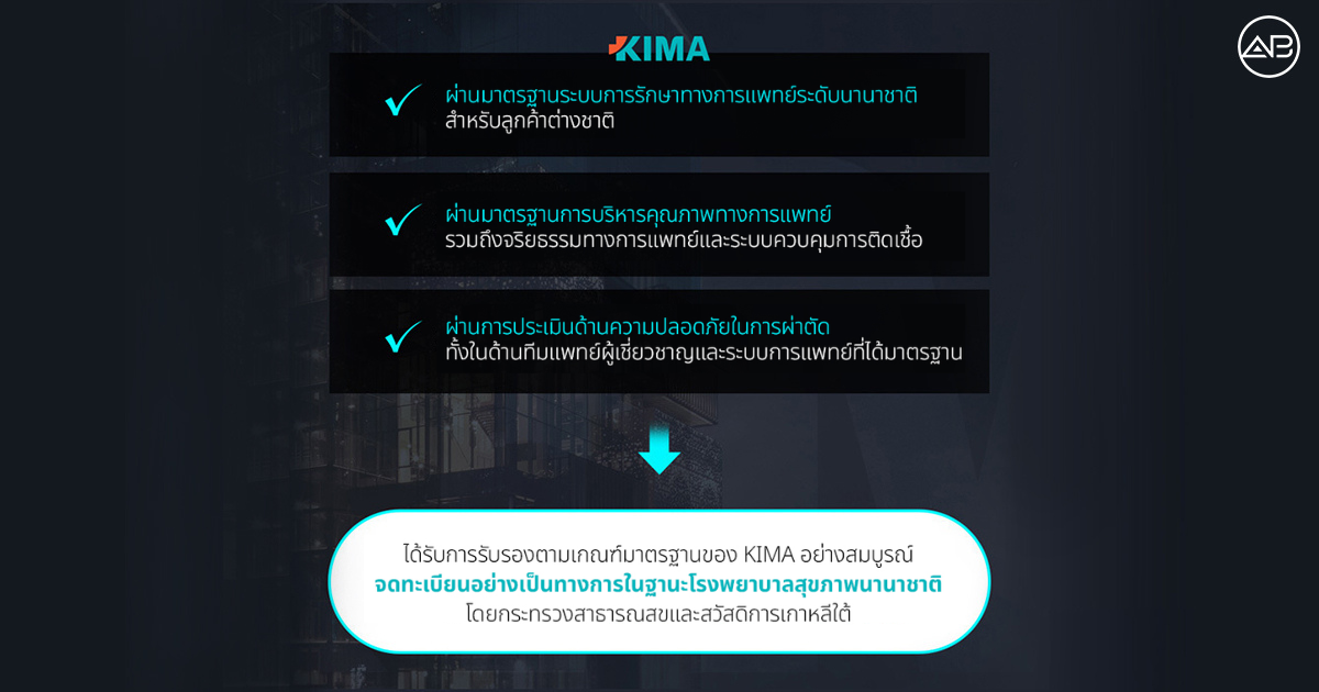 ระบบทางการแพทย์ที่มุ่งเน้นความปลอดภัยนี้ไม่ได้จำกัดอยู่เพียงมาตรฐานภายในของโรงพยาบาลเท่านั้น แต่ยังได้รับการตรวจสอบและยืนยันจากหน่วยงานภายนอกอย่างเป็นกลาง โดยโรงพยาบาล AB ได้รับการรับรองมาตรฐาน KAHF จากกระทรวงสาธารณสุขและสวัสดิการ (เกาหลี) รวมถึงได้รับการรับรองเป็นโรงพยาบาลสมาชิกอย่างเป็นทางการจากสมาคมการแพทย์นานาชาติเกาหลี (KIMA) ซึ่งหมายความว่าเป็นสถานพยาบาลที่ผ่านมาตรฐานระดับประเทศที่เข้มงวด ทั้งในด้านคุณภาพการให้บริการทางการแพทย์ ระบบบริหารจัดการความปลอดภัย ความเชี่ยวชาญของบุคลากรทางการแพทย์ และจริยธรรมทางวิชาชีพ