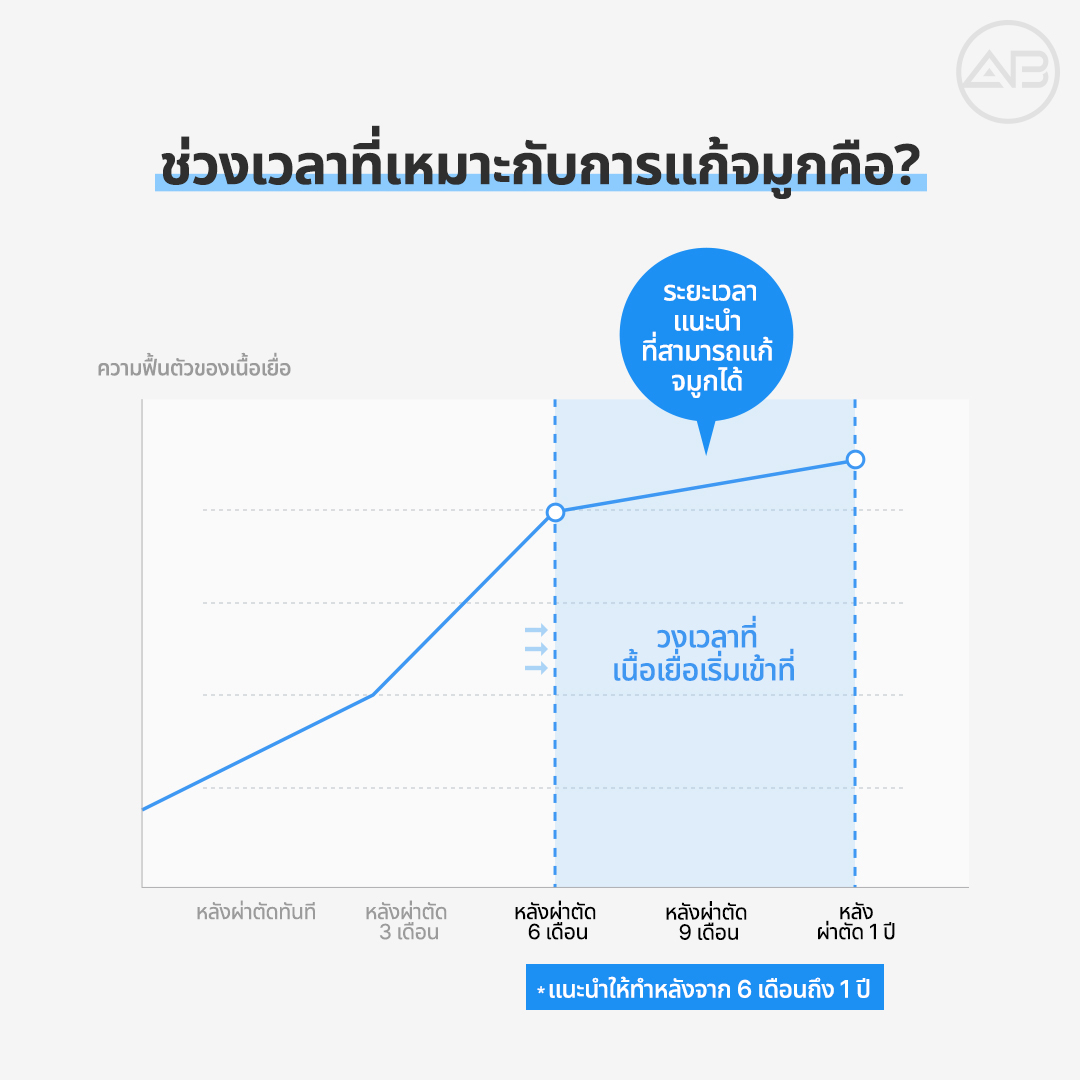 โดยปกติ หลังจากถอดซิลิโคนออกหลัง 6 เดือนเป็นต้นไป จะเป็นช่วงเวลาที่เหมาะสำหรับการแก้จมูกที่สุดครับ